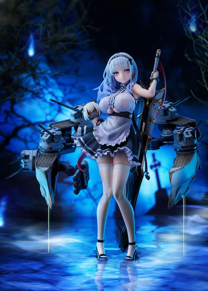 Yes, her name is Dido, and yes, that's spelled correctly. Bonk!Thanks to the fine sculpting abilities of Akane Jouge, the official Azur Lane game artwork of the light cruiser Dido has been realized as a three-dimensional figure! The busty bishoujo boat girl is exploding out of her classic maid outfit. Excellent shading really brings out the creases of the black and white dress. The calm expression on Dido-chan's face contrasts nicely with the beautiful yet menacing-looking, golden-trimmed long sword that she holds behind her back! And resting in her other hand is the precious doll she saved!