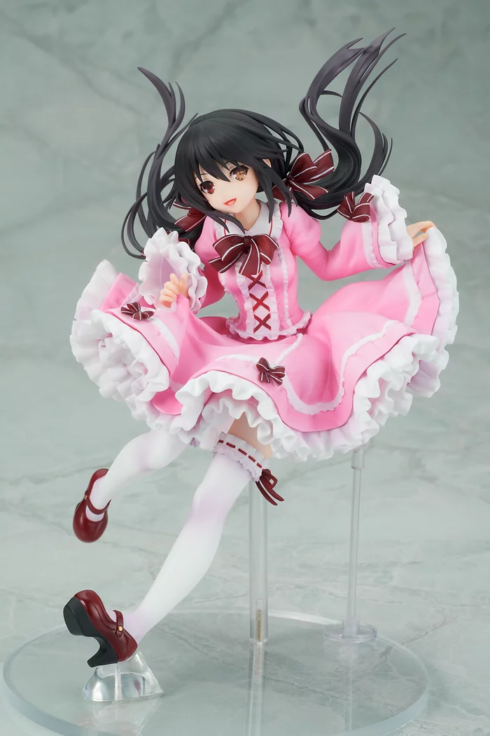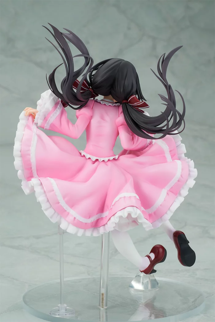 Incoming! Best Spirit waifu Kurumi Tokisaki from Date A Live is about to land right in your lap! This airborne Kurumi-chan stands at 7.7” tall, and she’s looking pretty in pink wearing an elegant and lovely gothic lolita dress. The pastel pink fabric goes well with her white ruffles and dark red ribbons, a reference to the colors of her traditional outfit. You really get the sense that she’s free-falling downward, with the way her twintails are blasting up above her head. Just be sure to have your arms out ready to catch her!