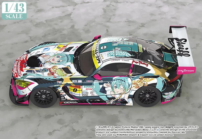 Add a piece of GOODSMILE RACING history to your collection! The Good Smile Hatsune Miku AMG race car that competed in the final race of the 2018 SUPER GT300 Class series is now a highly collectible diecast model. It features the car’s cute designs of Racing Miku by illustrator Hiro Kanzaki along with its innovative color scheme and sponsor logos all faithfully recreated. Its chassis is made of resin and aficionados will be able to appreciate every detail of the car’s body faithfully recreated in 1/43 scale. Display it in your collection alongside other GOODSMILE RACING race cars from throughout the years!