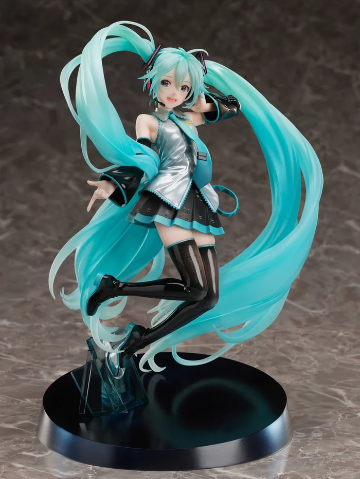 The main visual of Hatsune Miku from the “Hatsune Miku Chronicle” exhibition has been transformed into a 1/7 scale figure from F:NEX! Measuring 10”, illustrator Rella’s artwork of Miku-chan comes alive in figure form as she poses in her iconic outfit and jumps into the air, giving a radiate smile. Her voluminous twintails have been sculpted to show the intricate and beautiful flow of her long hair, and the clear material used toward the tips allows light to shine through beautifully. Each part of her outfit was also carefully sculpted to faithfully reproduce its different textures and detailed patterns, and that overall attention to detail has resulted in a stunning figure with details to enjoy from every angle. Don’t miss out on adding this special Miku figure to your collection!