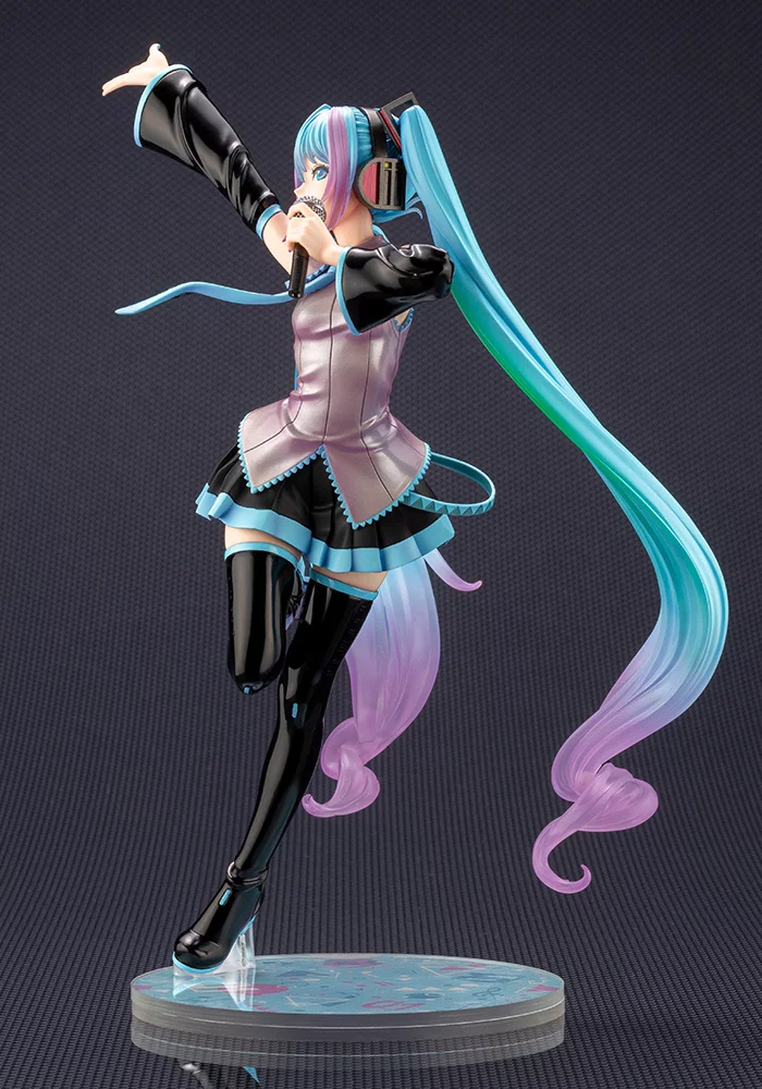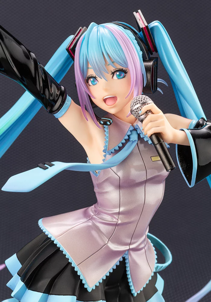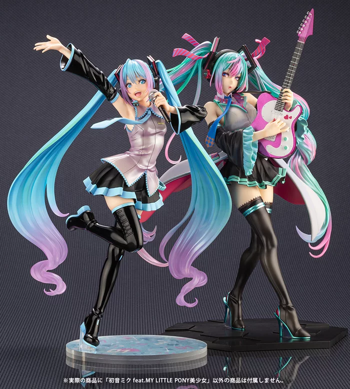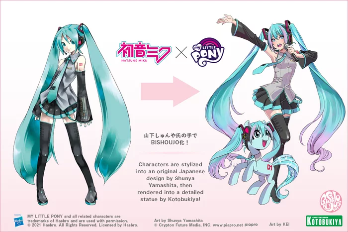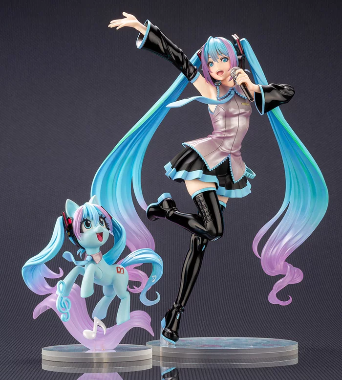 Kotobukiya is bringing fans a dream collaboration between Hatsune Miku and My Little Pony with this Bishoujo figure release! Based on artwork by Shunya Yamashita, Miku is captured in a fun, lively pose with one leg lifted as she sings into the mic and raises a hand high. Her outfit has been recreated with a wonderful luster on her tights and arm covers and metallic shine on her vest, and her signature turquoise twintails feature light gradation and clear parts for an impressive look as they flow down behind her.
