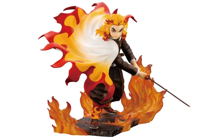 Warmhearted. Passionate. Steadfast. These words describe Demon Slayer's Kyojuro Rengoku, the Flame Hashira! And they're perfectly reflected in this figure sculpted by Ikkei Jitsukata! The intense-eyed Rengoku-san is posed making a powerful slicing attack. The ground beneath him has been scorched by his Flame Breathing technique as fire surrounds him! Over his shoulder, his hoari flaps looking like a flame itself, bringing to life the power and momentum of his strike!