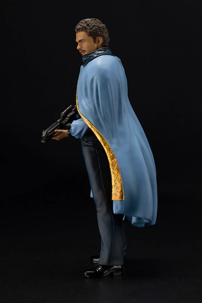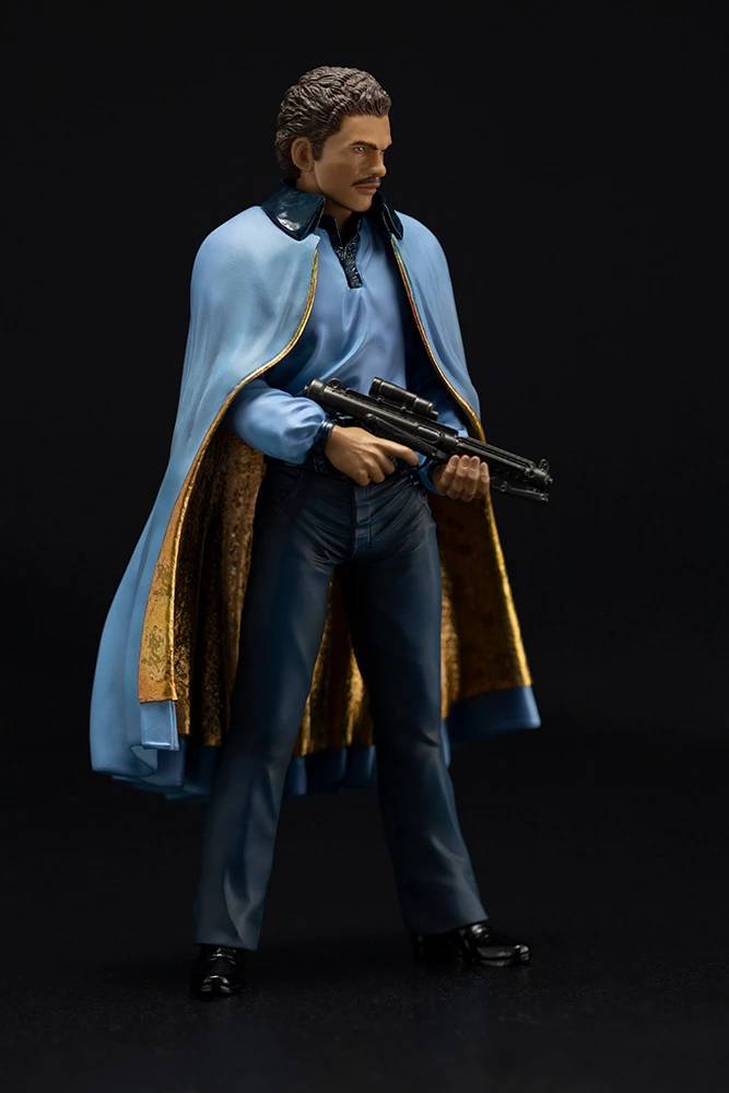 From Kotobukiya comes this ArtFX+ easy-to-assemble 1/10 scale figure kit of friend of Han Solo and original captain of the Millennium Falcon, Lando Calrissian from Star Wars: Episode V: The Empire Strikes Back in celebration of the 40th anniversary of the epic classic film. From smooth-talking smuggler to selfless leader, he stands 7.2” in a confident pose with a determined expression while holding his blaster rifle and donning his cape (removable) completed with shiny patterned gold paintwork and a glossy dark collar. Bring even more of the Star Wars universe into your home with the Baron Administrator of Cloud City Lando recreated in stunning detail!