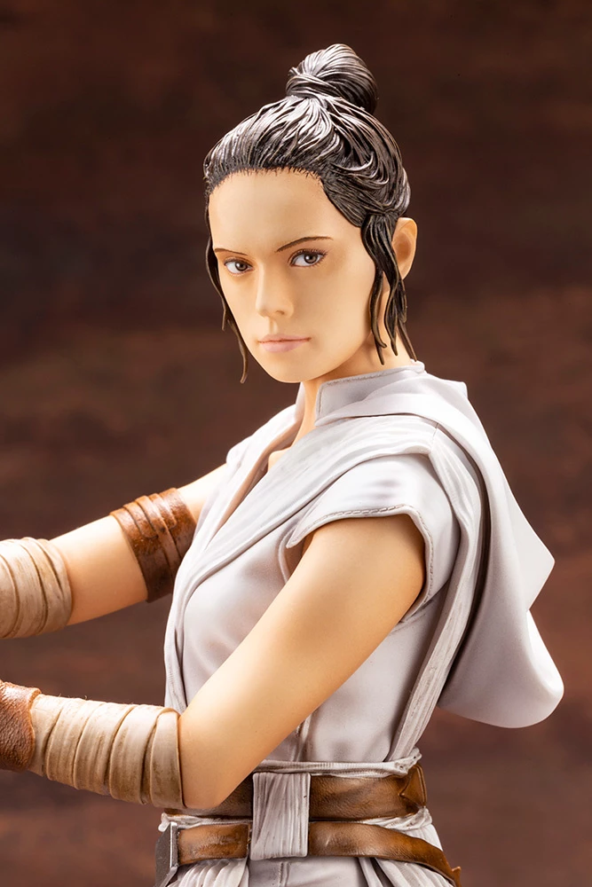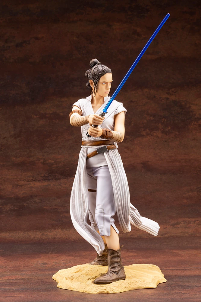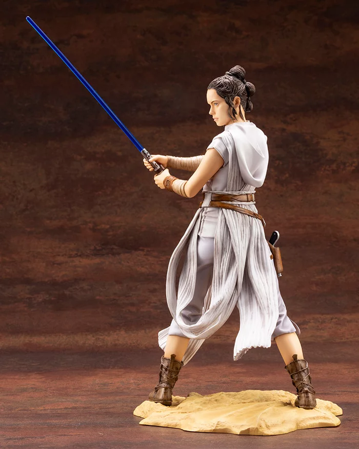 For this 11.4” figure by Kotobukiya, Rey looks to the distance with her head turned and a calm expression on her face. She grips her signature blue lightsaber with both hands but still carries a trusty blaster in her holster. The wind pushes at her robes. Something is coming, but the Rey we know takes any challenge head on!