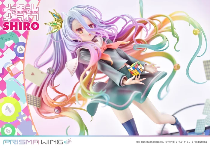 From Prime 1 Studio’s new Prisma Wing series of high quality figures comes one half of the genius gamer duo Kuhaku from the anime No Game No Life, Shiro! Measuring 10.6" tall, the cute gamer girl’s charm is fully captured as she poses with a Rubik’s cube in her hand and her vibrantly colorful hair fluttering all around her while she gives a confident if slightly haughty side glance. She stands on a circular chessboard-pattern base covered in all manner of games, including playing cards, chess pieces, billiard balls, and a computer monitor showing a chess match. With so many details to enjoy, no fan will want to miss out on adding her to their collection!
