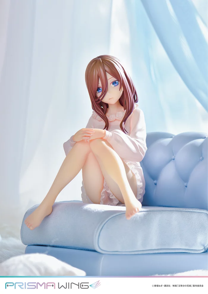 From the hit movie The Quintessential Quintuplets the Movie come 1/7 scale figures of the five Nakano sisters! Produced by Prime 1 Studio for the Prisma Wing figure line, this time the third-born sister Miku is captured at 6.3" tall sitting on a sofa in her stylish white nightgown from season 1’s ending artwork. Careful sculpting and paintwork capture her lovely look in detail, from her stoic yet expressive blue eyes, to the frills, wrinkles, and soft look of her nightie, and even her cute sitting pose. All of which combine to bring out her charm in 360 degrees.