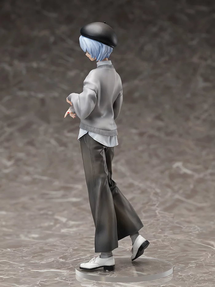 Rei Ayanami is looking très chic in her TYPOGRAPHY OF EVA sweater. She stands at 9.8” tall and 1/7 scale. Her sweater is combined with a black beret, light gray plastic frame glasses, and loose fitting dark gray pants. This is a special variant color scheme for the figure. If you’d rather pick up Rei sporting the colors of the original Yoneyama artwork, that’s available, too!
