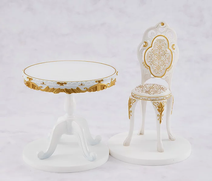 Highlights include the fine sculpting and painting of her outfit including its frills and the way her long sleeves drape down to the floor with a gentle movement, her bright, cheerful expression, and her long silver hair that flows down her back. A table and chair with ornate gold details are also included to create the scene. Display her together with Ram, Rem, and Beatrice to complete the tea party in your collection!