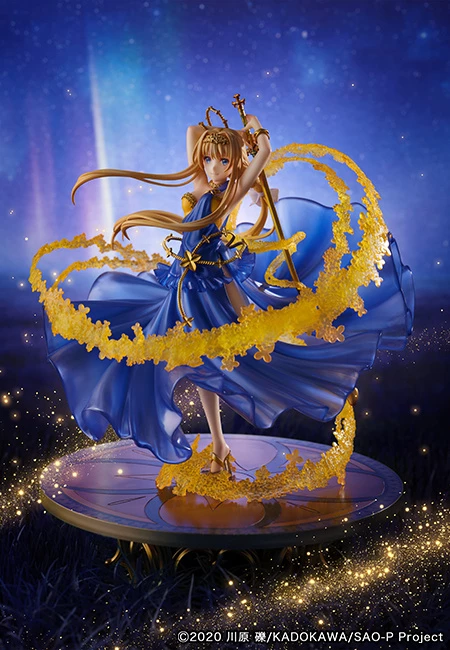 Sculptor Design Coco and eStream continue to impress in their Crystal Dress series with this beautiful 1/7 scale figure of Alice from the Sword Art Online series! At 13.8" tall, Alice stands on an elaborate raised base that reminds you of a ballroom from a fairytale. The extraordinary sword fighter is wearing a translucent midnight blue dress. Her movement causes the dress' skirt to lift 360 degrees around her body, like a blue flower in bloom! Alice's two hands reach behind her head gripping onto her iconic sword, Fragrant Olive. It creates an enchanting golden yellow effect that swirls around her. What results is the perfect marriage of blue and gold for our noble heroine!