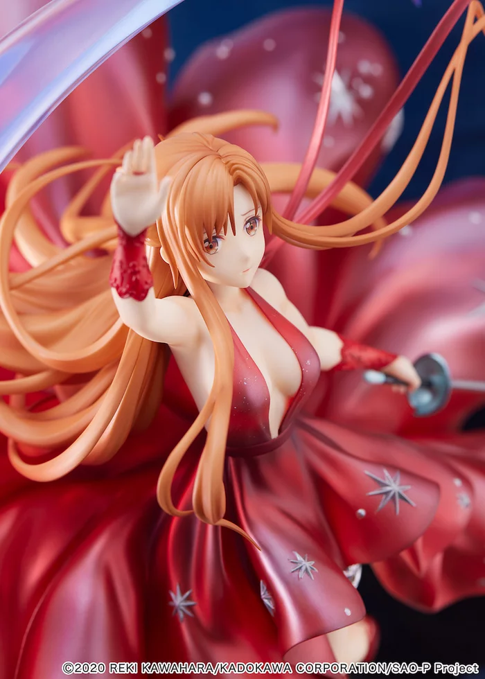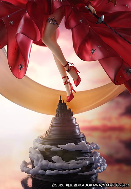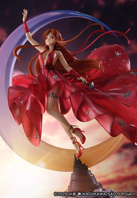 Fighting evil by moonlight, she is the one, it's… Asuna!Introducing an homage to Sword Art Online Progressive: Aria of a Starless Night! Measuring nearly 15" tall, "Asuna: Crystal Dress Ver." depicts the SAO heroine adorned in an enchanting, vibrant red ballroom gown with matching red heels. Her formal skirt spreads out like a flower in bloom while silver stars dot the attire all around its edges.