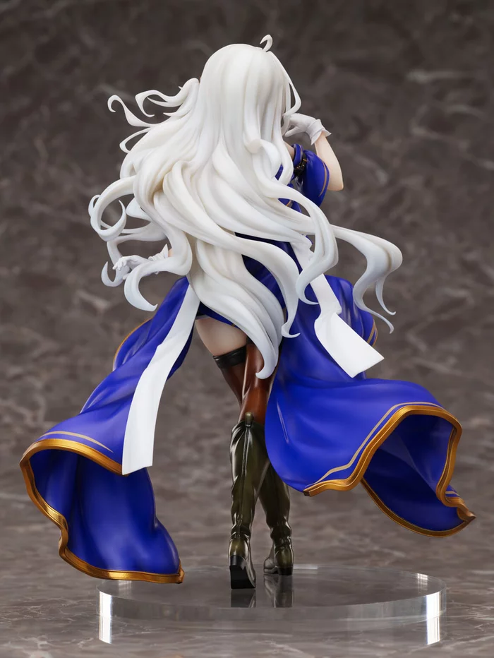 Her long dress flows beautifully with her movement and has been painted a vibrant blue and gold that contrasts wonderfully with her ashen white hair that cascades down her back. Even the subtle details like her garter belt, the wrinkles and leather look of her boots, and the ribbon around her neck have been carefully sculpted. With so much detail to enjoy, this is definitely a figure you’ll want to admire from every angle!